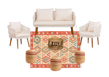 Conjunto de sofá 2 plazas, 2 sillones 1 plaza, alfombra y mesa (Pufs no incluidos).