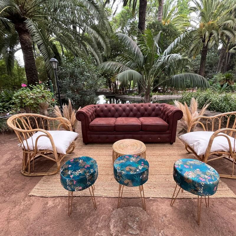 Conjunto de sofá Chester de 2 plazas, 2 sillones de bambú, alfombra, mesa y 3 pufs terciopelo más 2 cestas con pampas.